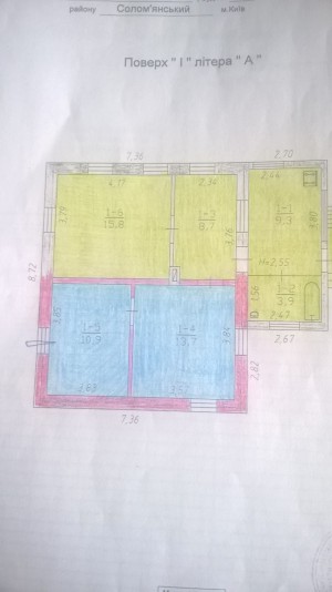 Продается 3/4 части одноэтажного дома в Соломенском районе ул. Травнева кирпичный дом, все городские коммуникации, 65/24.5/9. 3, (комнаты 15.8, 8.7 и кухня 9.3), высота 2.6 м, подвал - два помещения 12.4 м2 и 10 м2 , высота в подвале 2. 15 м. На плане продаваемая часть дома обозначена желтым цветом. Продаваемая часть земельного участка 5.23 соток, участок ровный правильной формы, фруктовый сад, ягодные кусты. Отличная локация: до центра рукой подать, прекрасная транспортная развязка, удобный подъезд, рядом озера. По соседству новые современные частные жилые дома и многоквартирные дома . Состояние дома хорошее. Возможна продажа всего дома дома, 87/40, 9/9. 3 м2 и всего земельного участка 7.07 сотки. Соседи владеют только двумя комнатами: 10.7 м2 и 13.7 м2, а также 1.84 соткой земли. На право первоочередного приобретения соседи не претендуют. Часть дома на плане голубым цветом обозначенная - владение соседей. Без комиссии. +380675053730; +380502532829