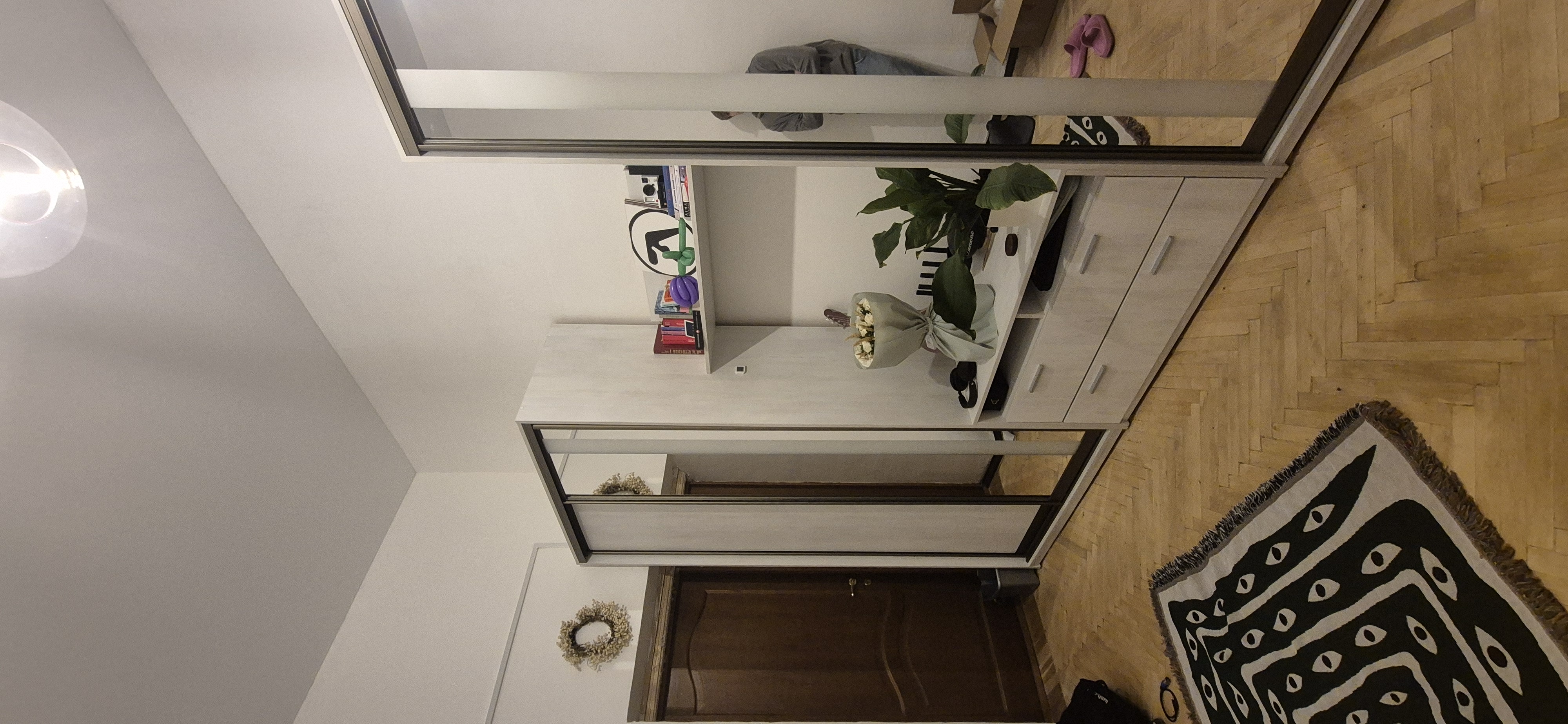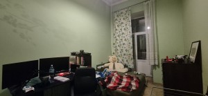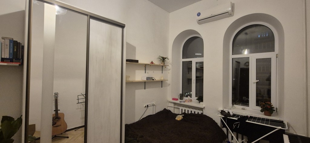 Вікна однієї кімнати та кухні виходять на Велику Васильківську з видом на Олімпійський, вікна іншої кімнати – на подвір’я та Конституційний суд.
