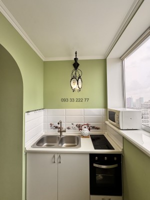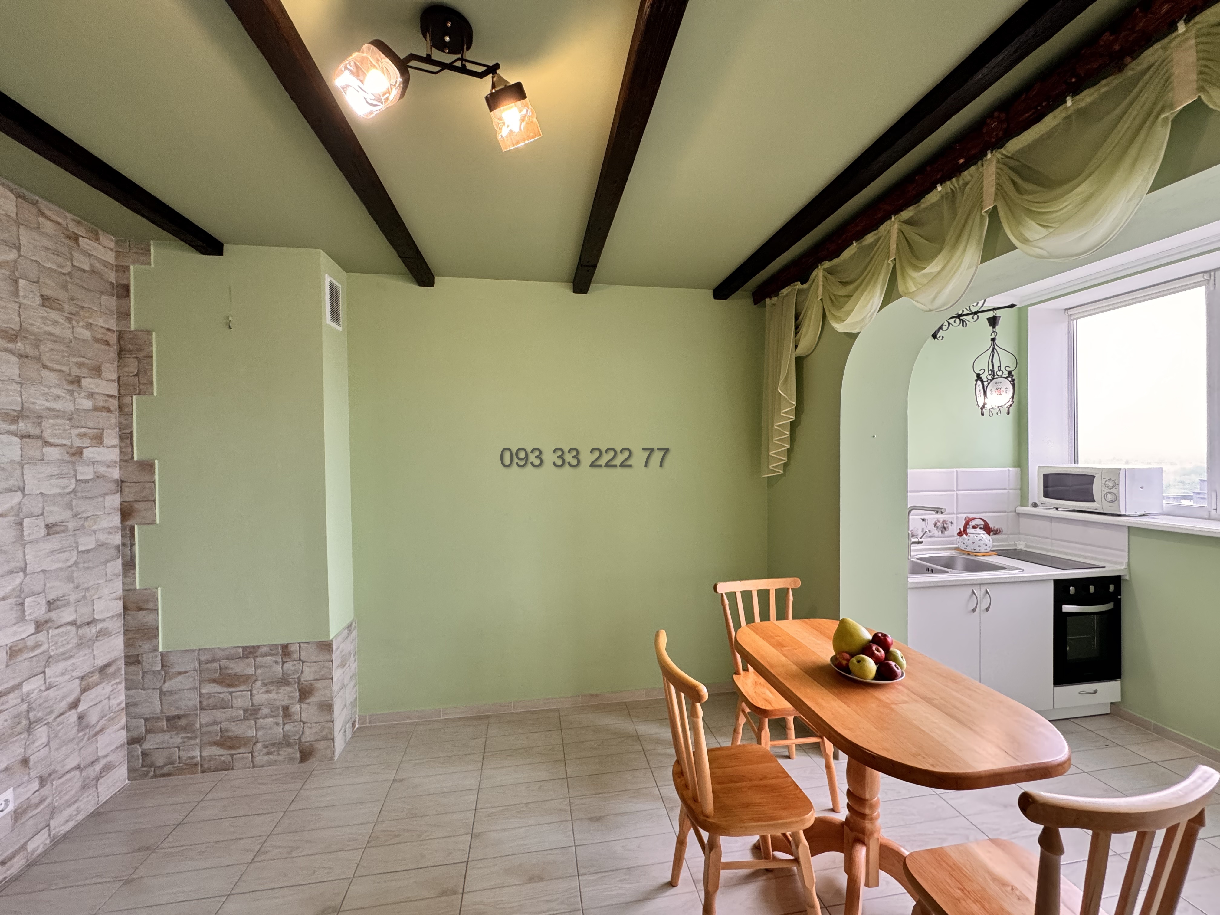 Вбудована кухня площєю 12 кв.м. з електричною плитою та духовою шафою, кондиціонером, мікрохвильовою піччю, холодильником, деревʼяним столом та стільцями, встановлена система зворотнього осмосу.