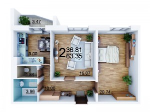 - комнаты — 20,74м и 16,07м,