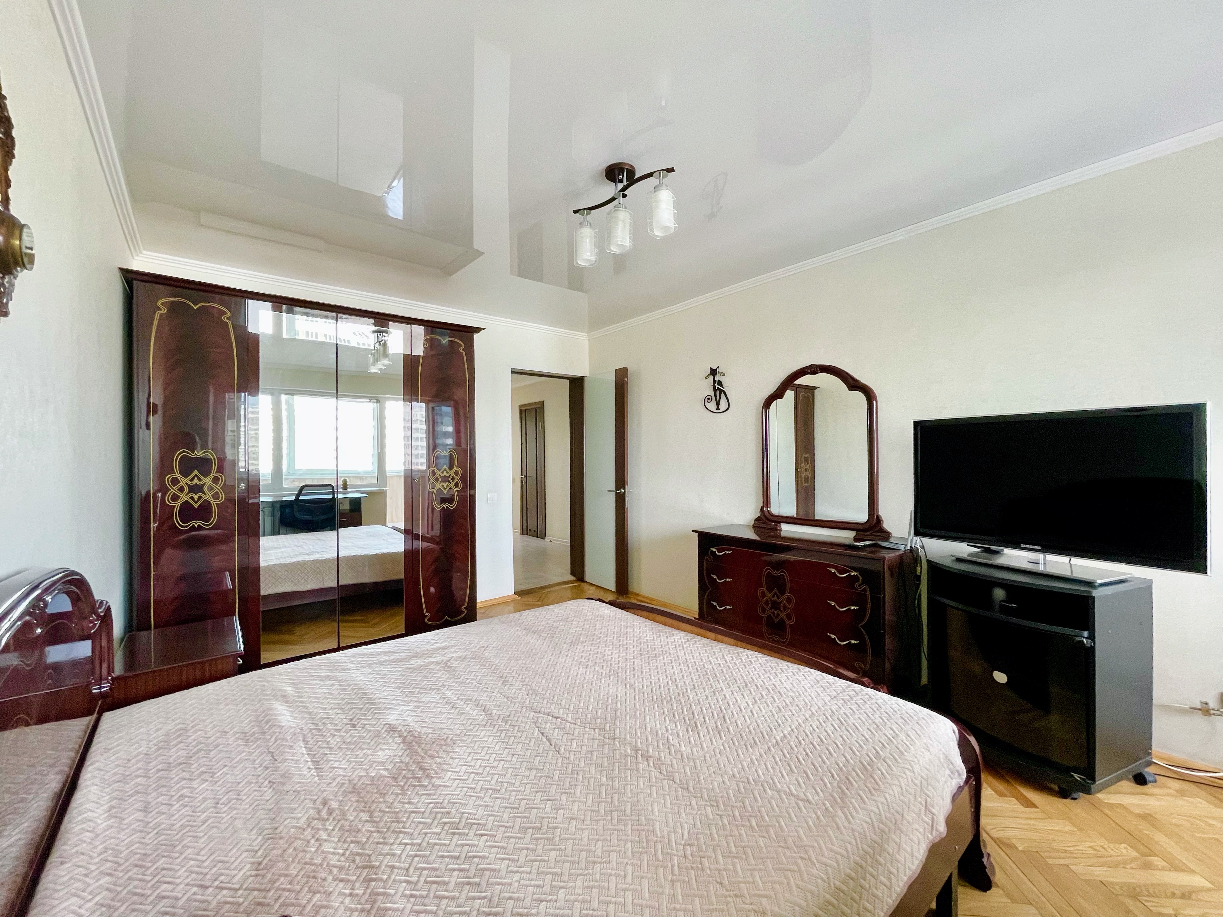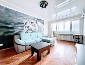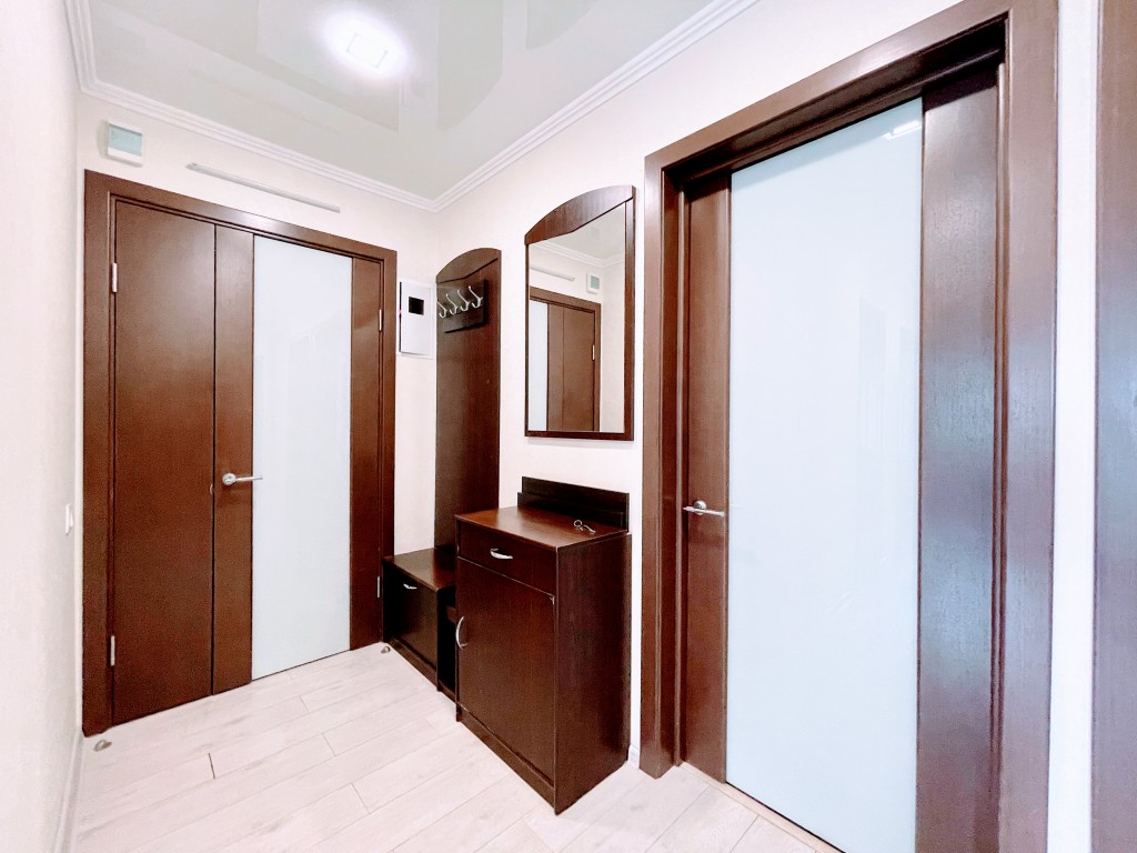 Меблирована. Две застекленные лоджии. На кухне встроенная мебель с бытовой техникой. Ремонт в светлых тонах. Установлен кондиционер. Санузел раздельный. В ванной бойлер на 80 л. Стиральная машина автомат.